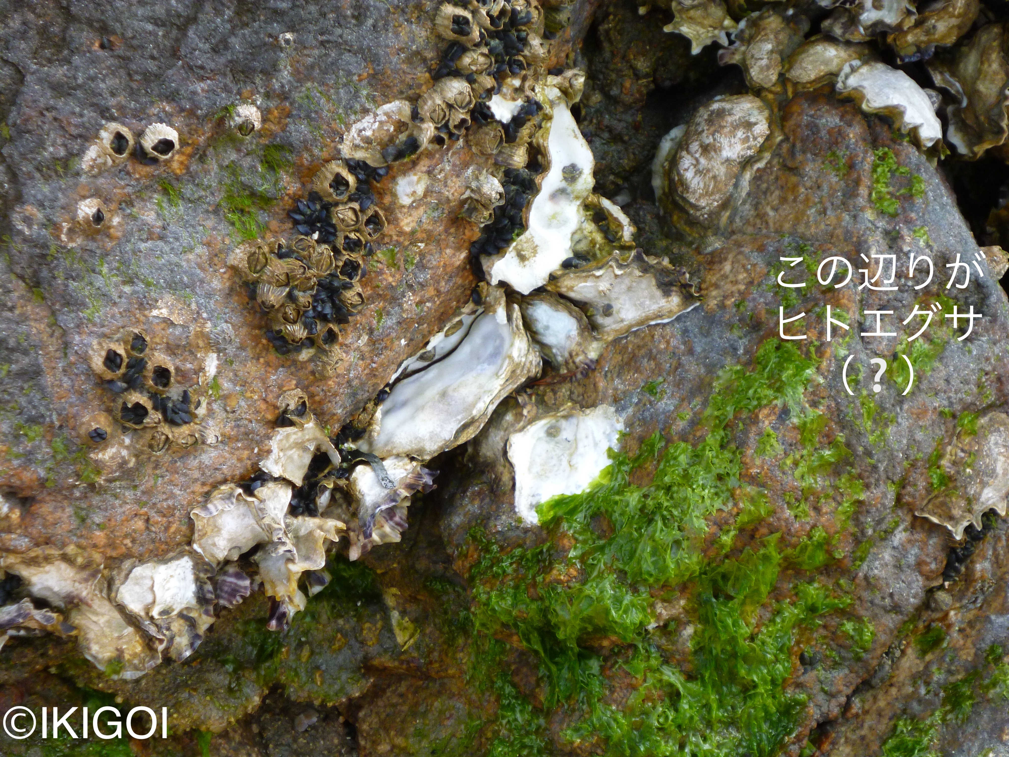 このヒトエグサというものは、潮間帯と呼ばれる岩礁のいわゆるタイドプールの中にある、潮が一番満ちた時にできる線と、潮が一番引いた時にできる線の間にある域を代表する海藻類である。魚介類売り場でアオサとして知られている、数種のアオサ類に近縁である。岩礁などの壁に張り付いたり、砂に付着したりするが、後者の方は流されやすく、多くの環境で見ることができる。アオサ類の分類が難しく、自分も確信は持てないが、ヒトエグサだと断定した種類だ。