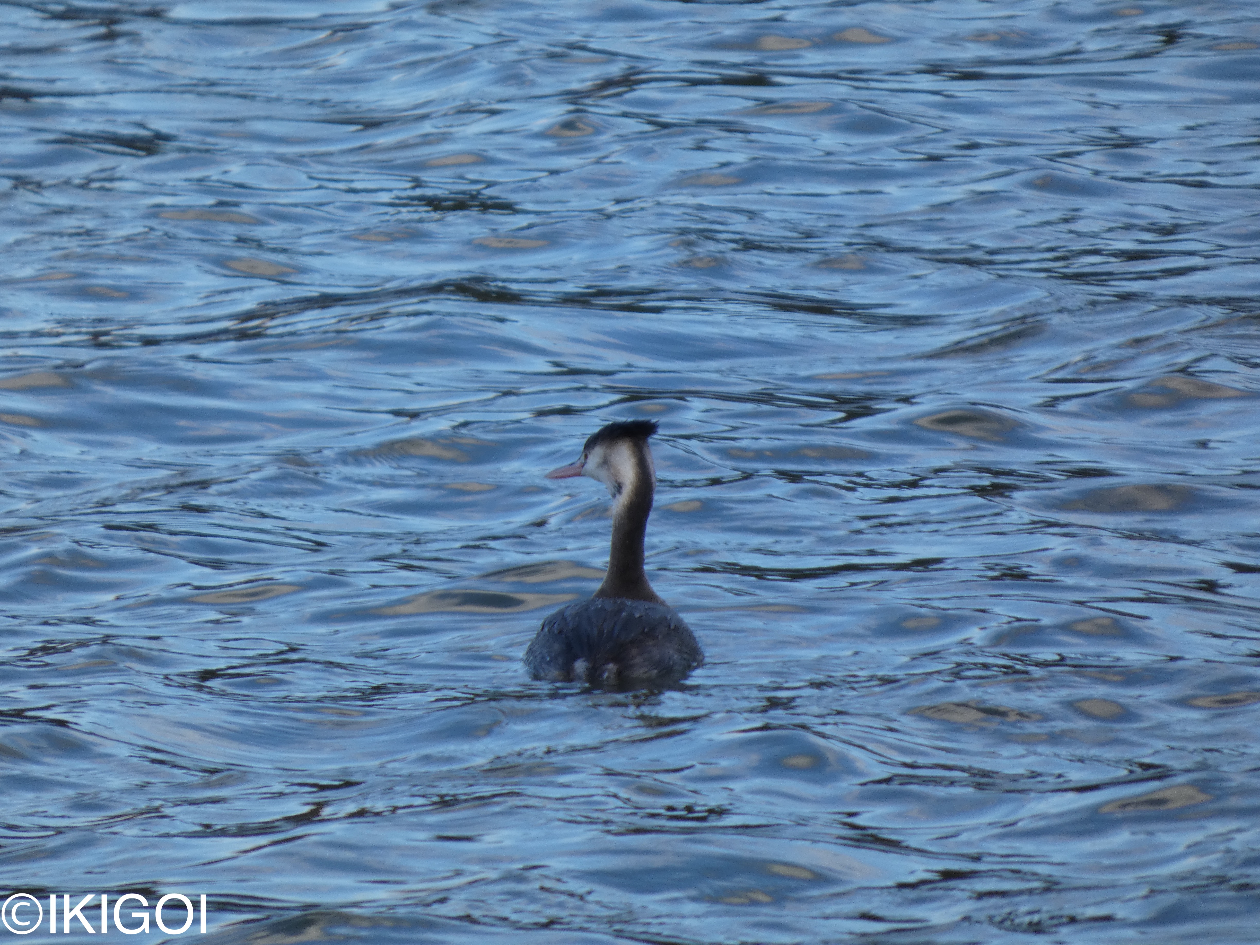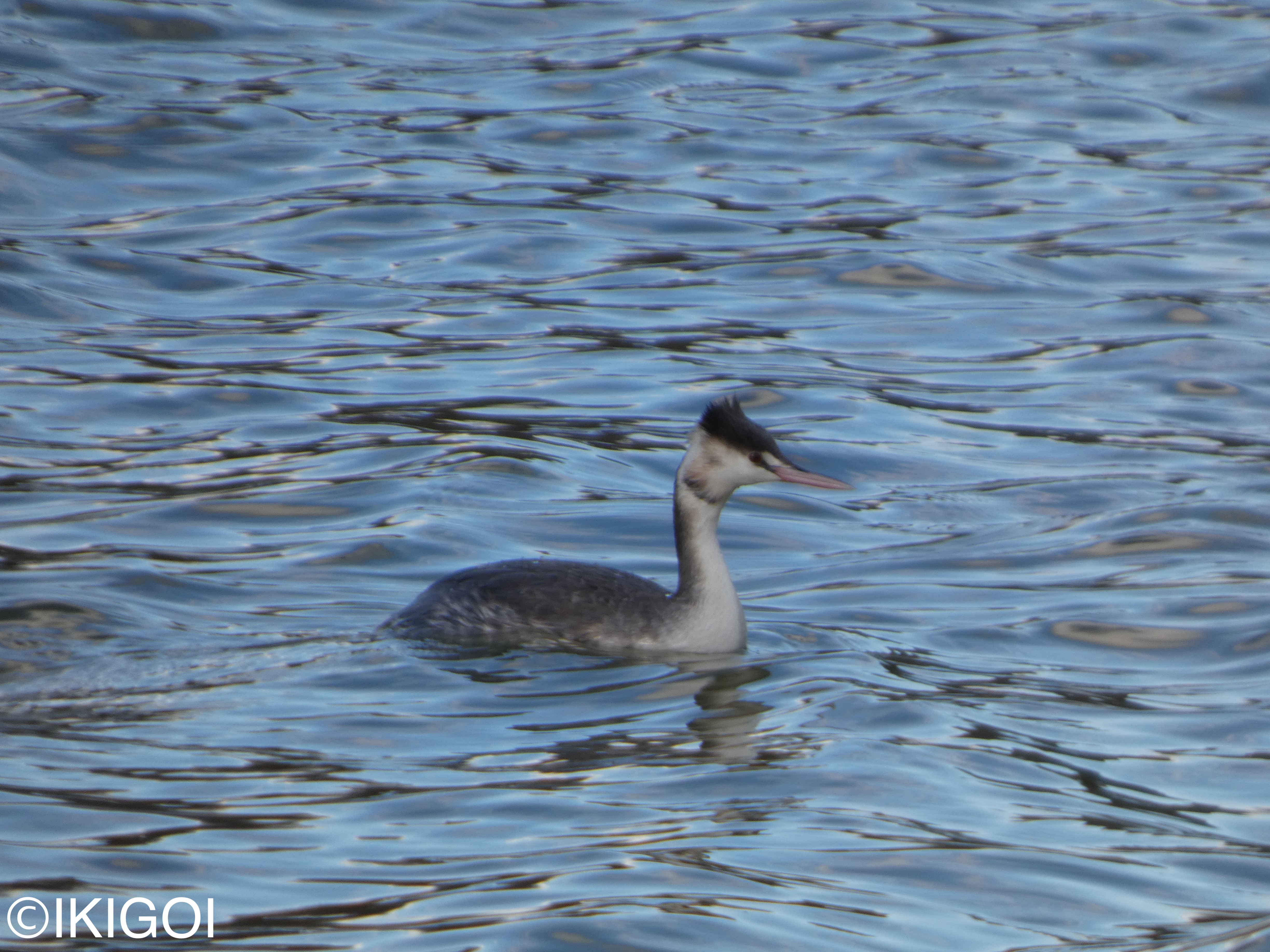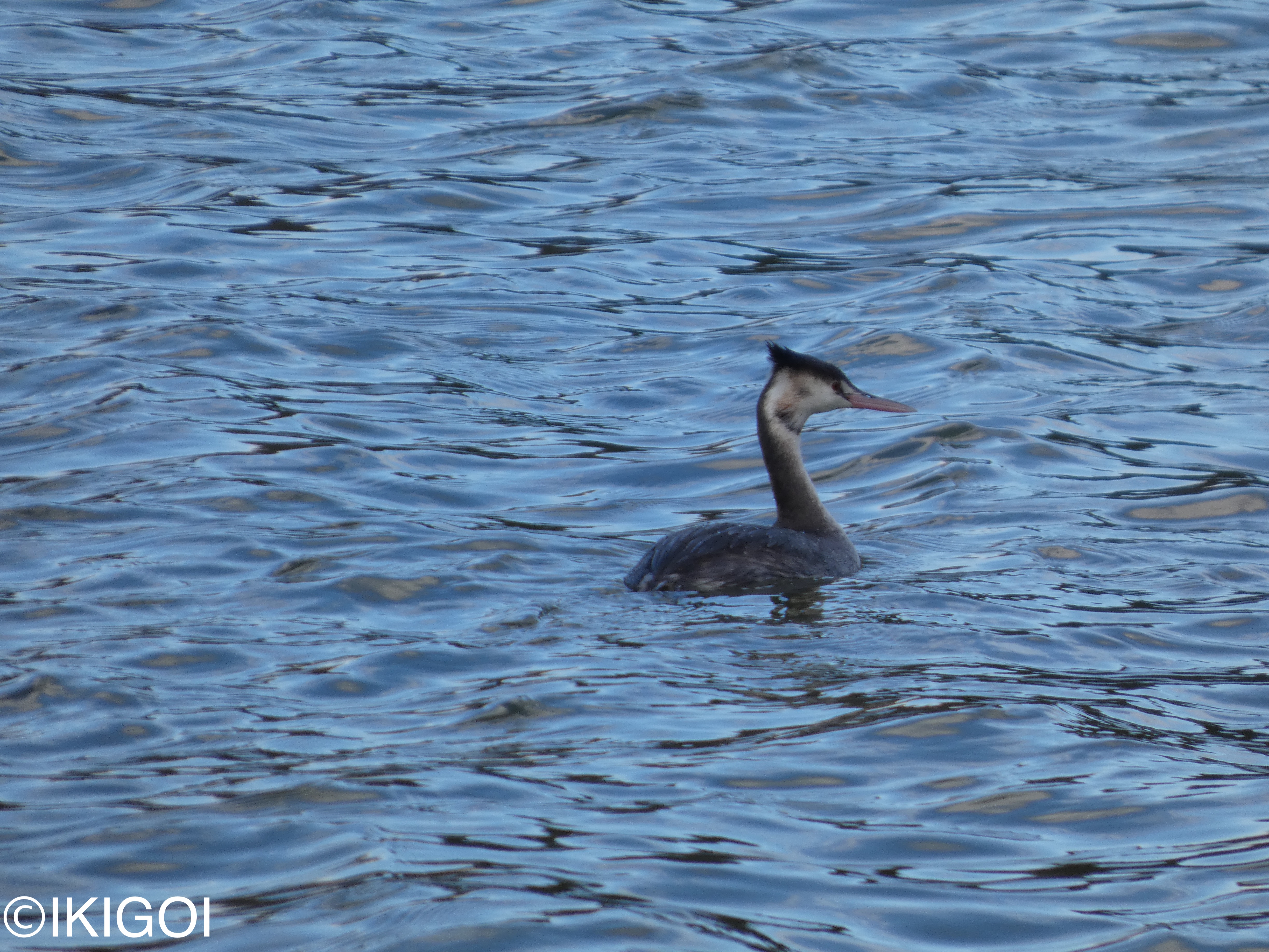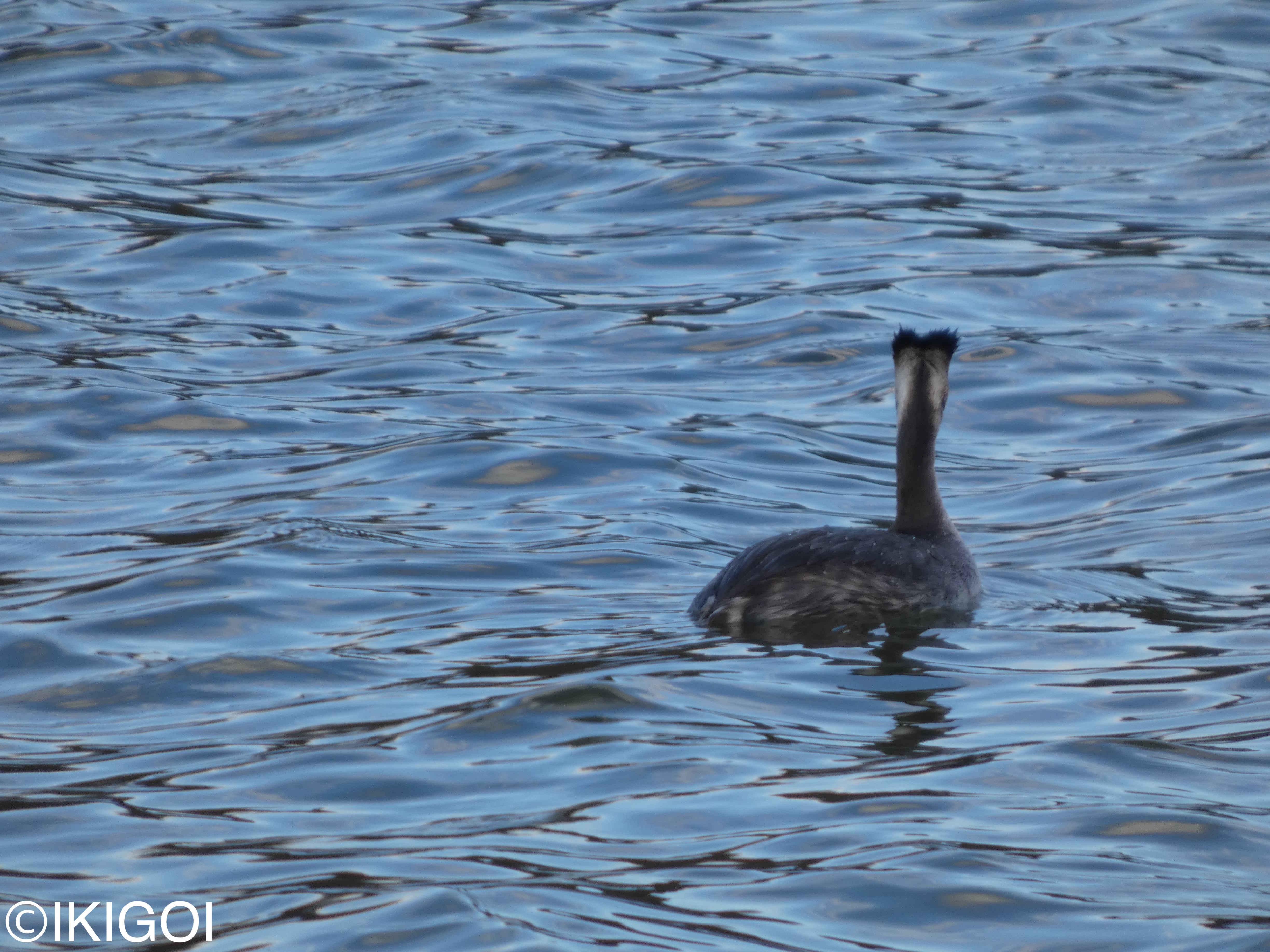 カンムリカイツブリはその名前の通り冠があり、その部位のことを冠羽という。冠羽は、カンムリカイツブリとアカエリカイツブリしか持たない特徴的な部位なのである。そのどちらの種類も分類学上はカンムリカイツブリ属であり、冠を持っている意味もなんとなくわかるであろう。このカンムリカイツブリはカイツブリ類にしては大きく、近くで見るとなかなか迫力のあるものであり、コガモほどのサイズはある。カモとおなじサイズの潜るカイツブリがいるとなかなかびっくりするものである。