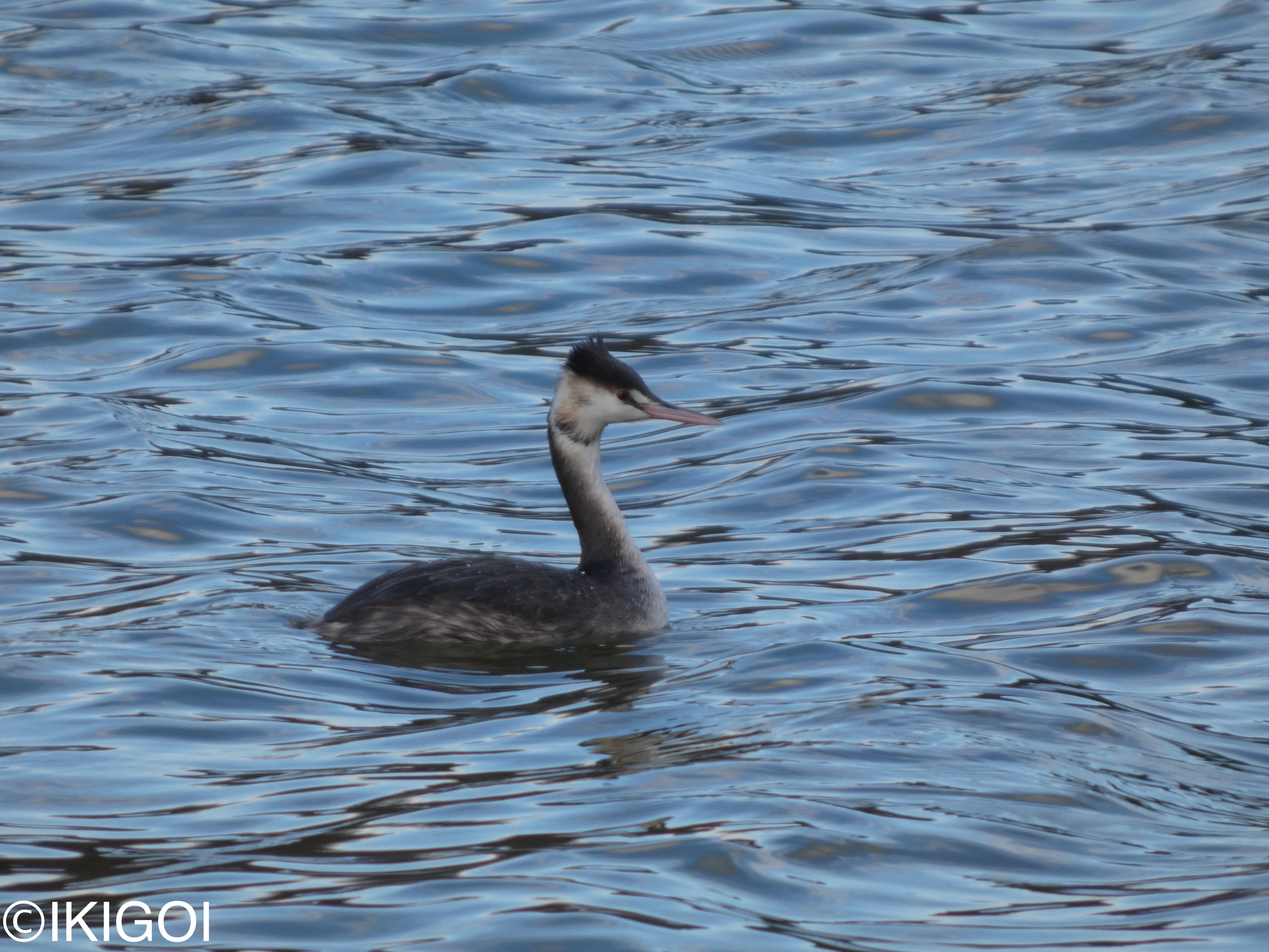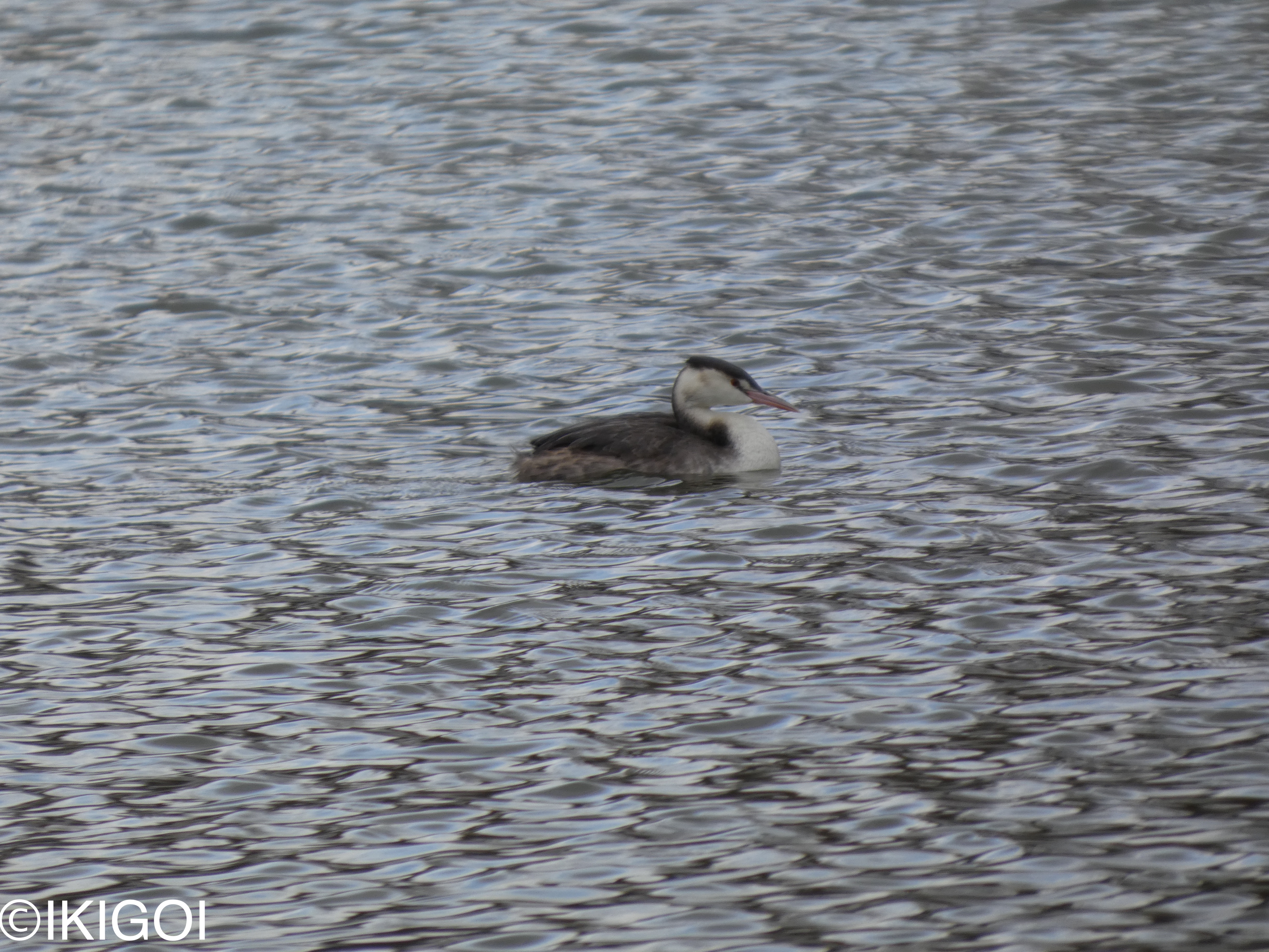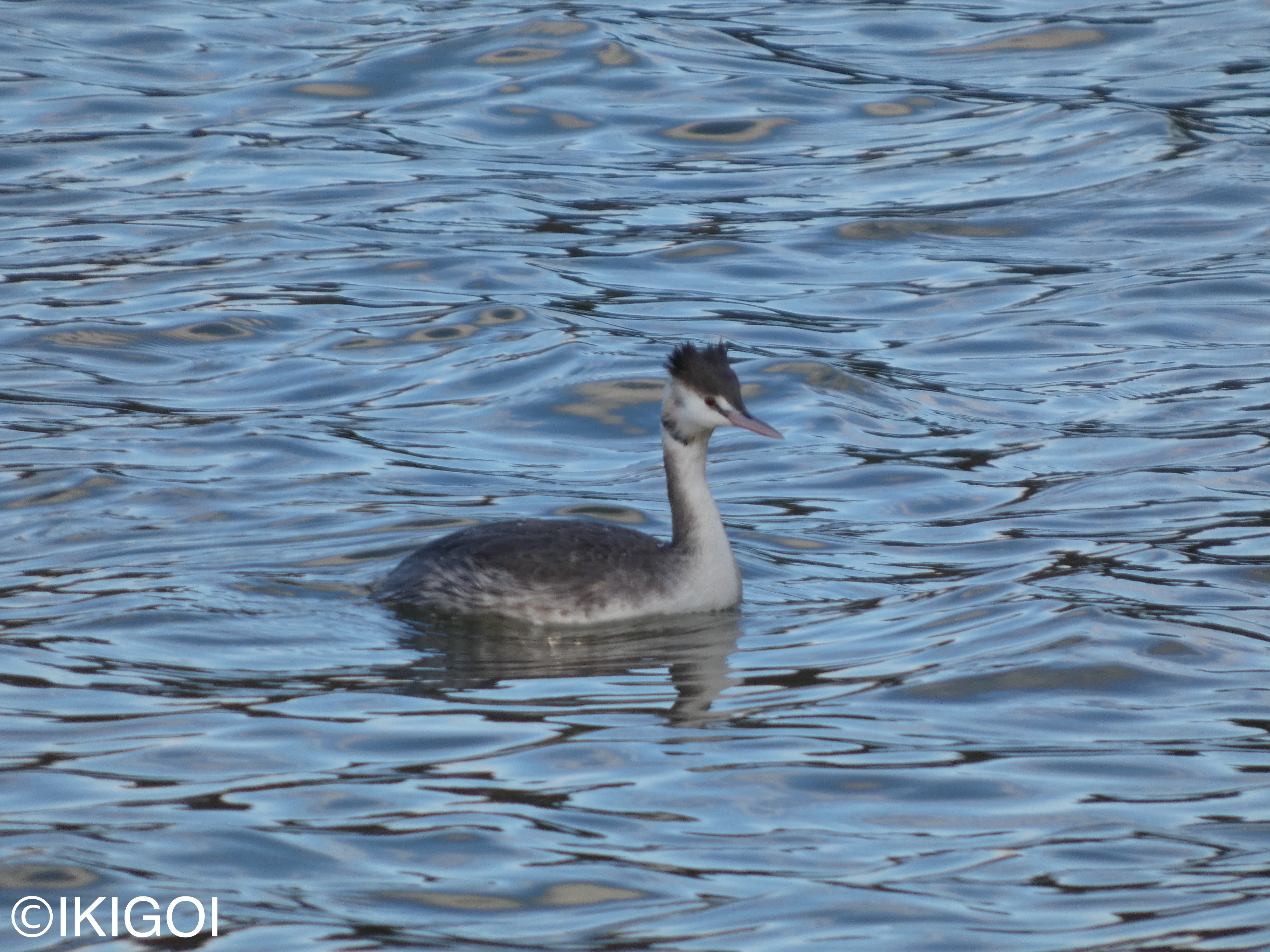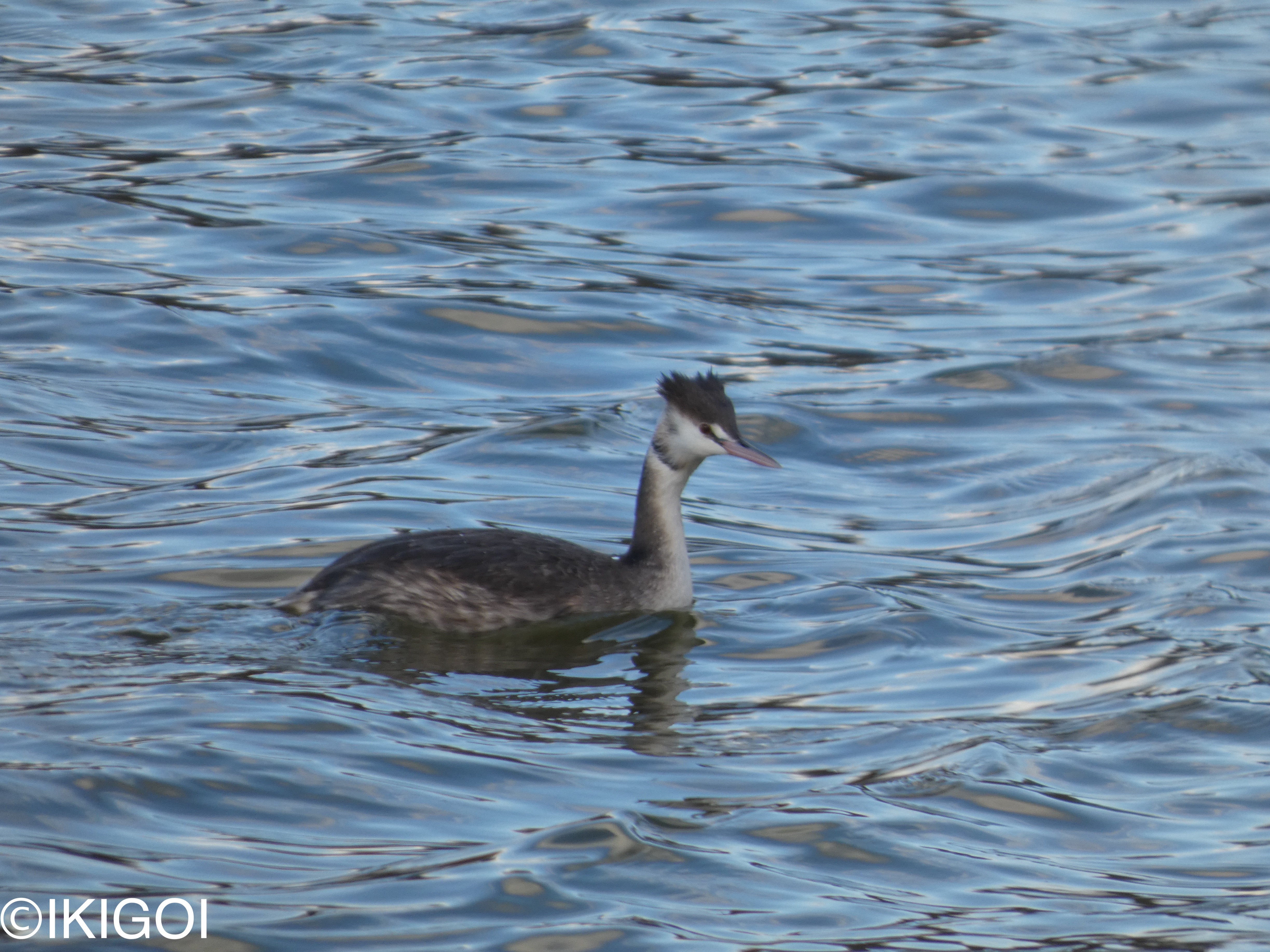 カンムリカイツブリはその名前の通り冠があり、その部位のことを冠羽という。冠羽は、カンムリカイツブリとアカエリカイツブリしか持たない特徴的な部位なのである。そのどちらの種類も分類学上はカンムリカイツブリ属であり、冠を持っている意味もなんとなくわかるであろう。このカンムリカイツブリはカイツブリ類にしては大きく、近くで見るとなかなか迫力のあるものであり、コガモほどのサイズはある。カモとおなじサイズの潜るカイツブリがいるとなかなかびっくりするものである。
