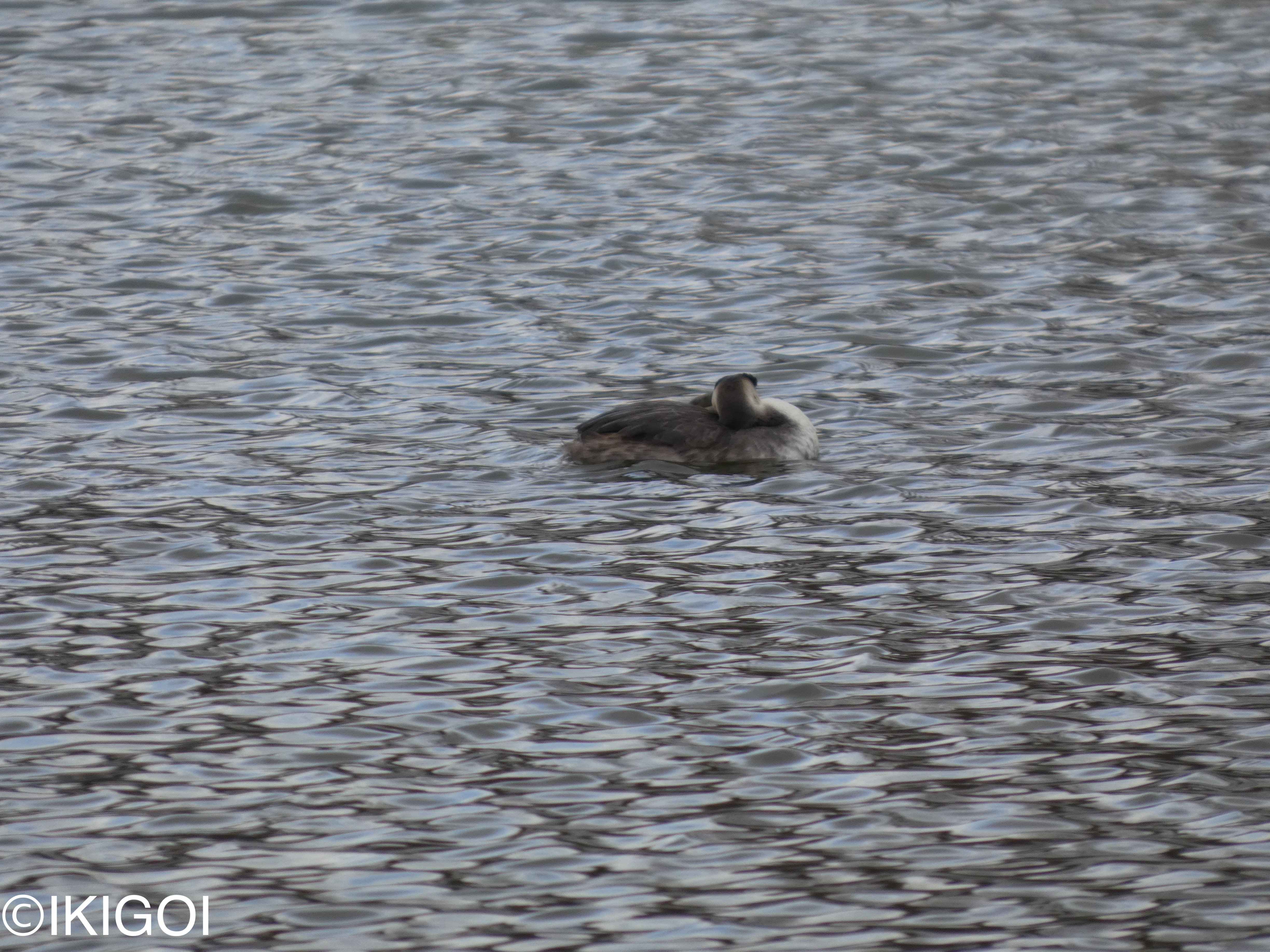 これが寝ている時の様子である。カンムリカイツブリはよくお上品な寝方をするということで知れ渡っており、これを見ても、首をしっかり曲げて折りたたんで寝ているので、寝方は決して悪くはない。しかしこの写真だけだと毛繕いかねているのかがわからない。首を折りたたむことでの判別の悪さはここに現れている。