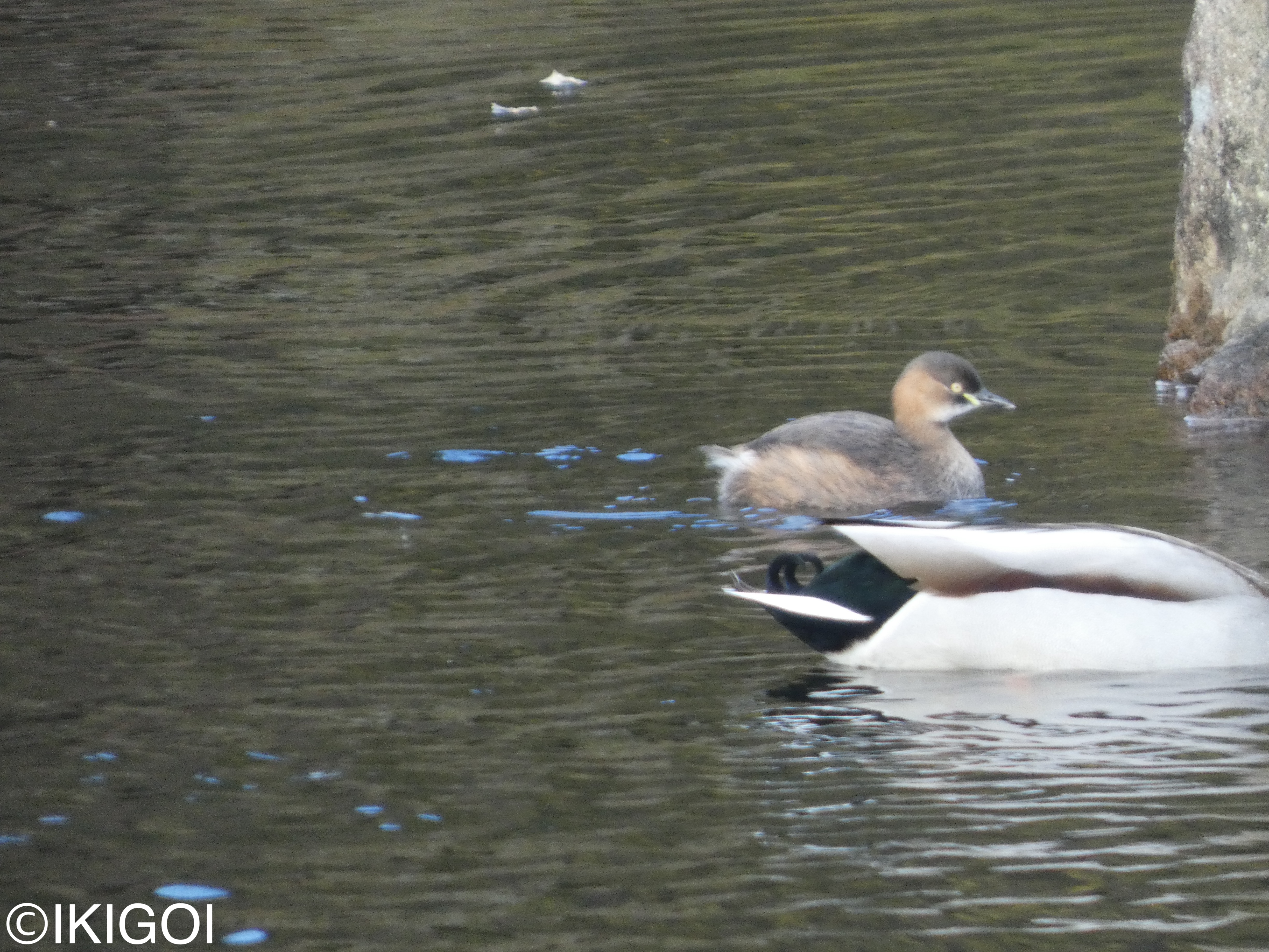 カイツブリってどんだけ小さいのって方向けにこの画像を用意した。手前はマガモである。首を伸ばしたマガモと比較するとカイツブリはマガモの3分の1となる。この大きさなものだから、遠目から見ると落ち葉にまで見えてしまうこともある。潜ったり沈んだりする様子も枯れ木のように見えるのが現状である。ぜひ皆は見間違えずに探してほしい。