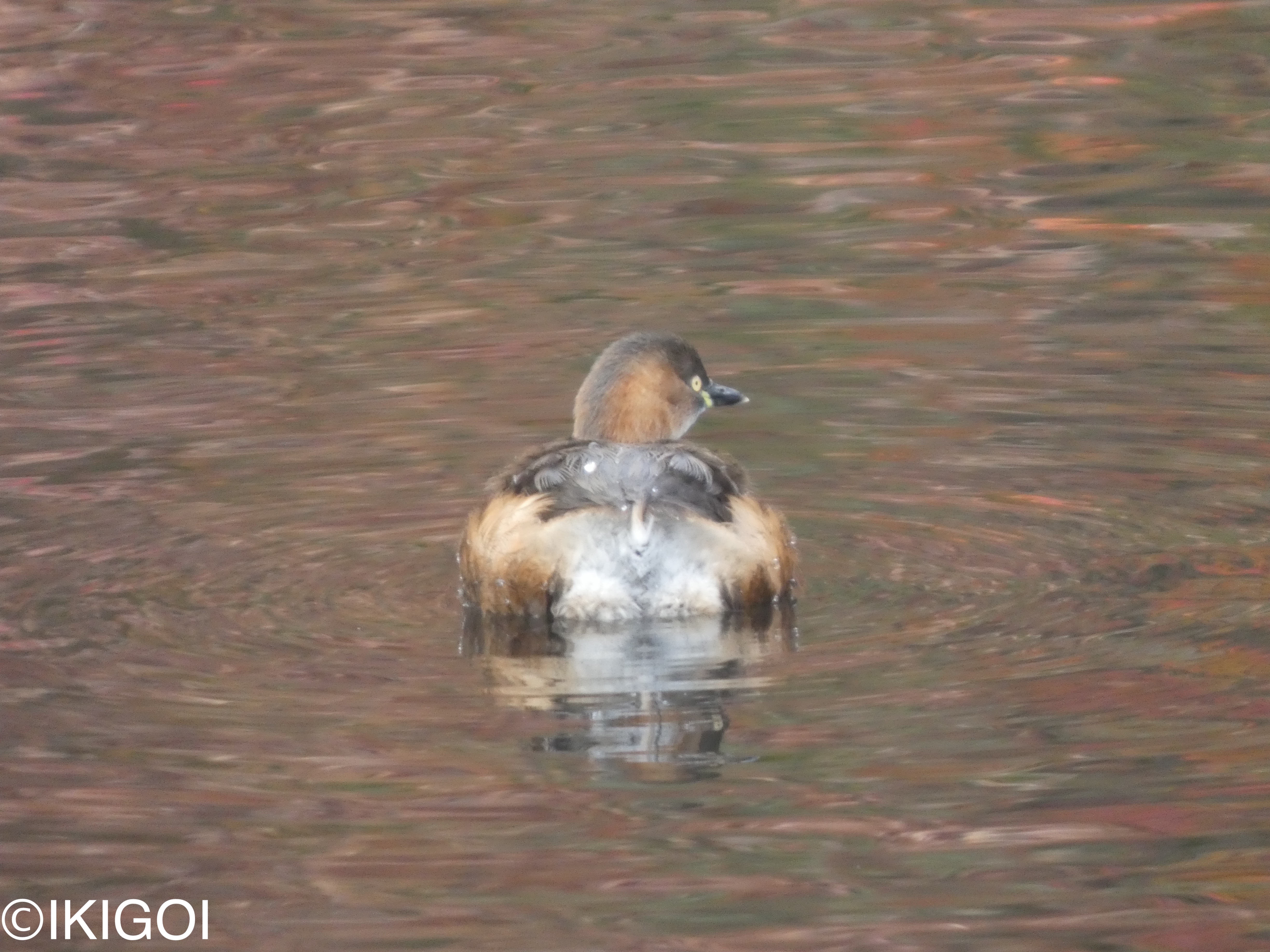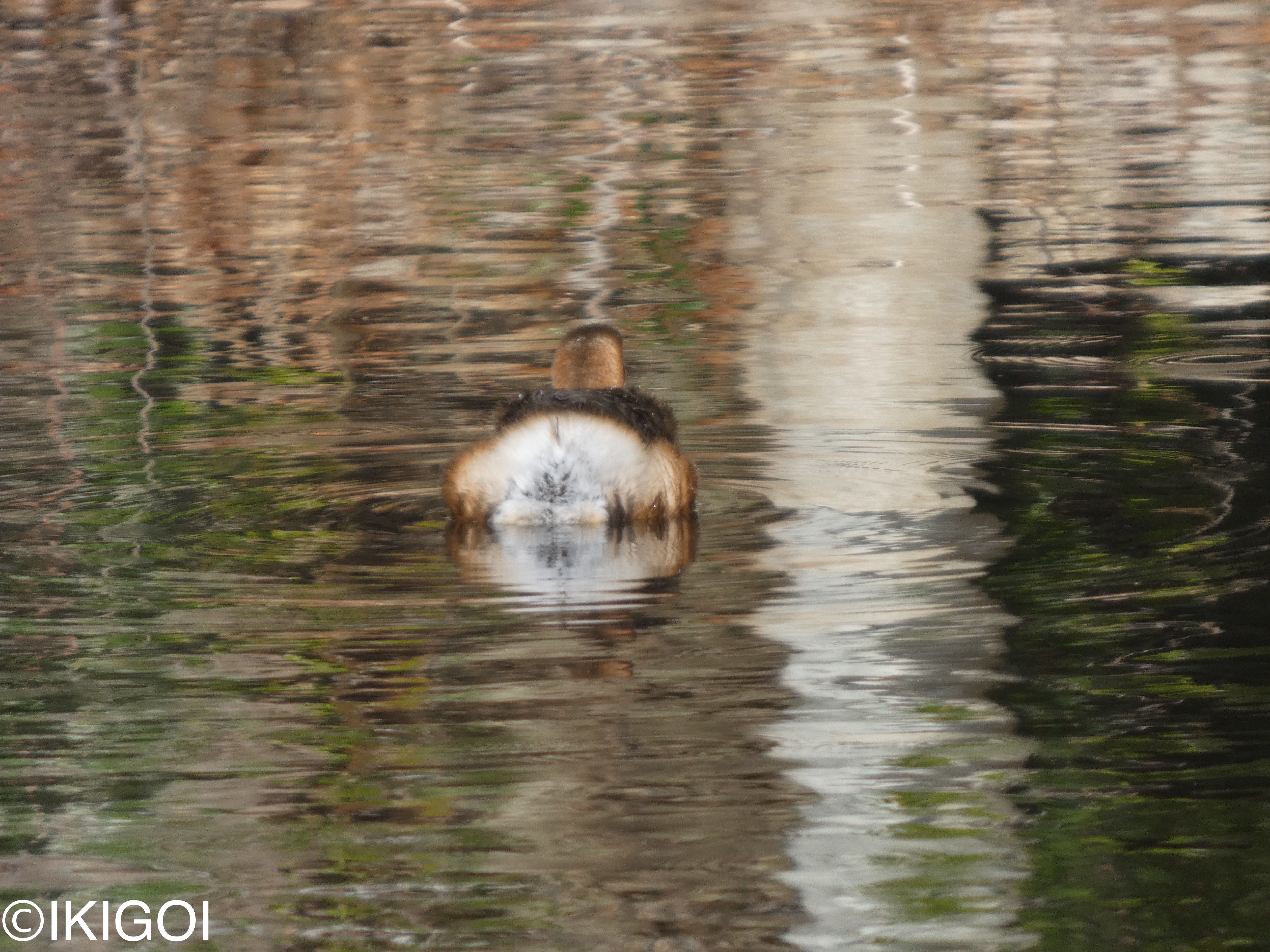 カイツブリを後ろから見ると、ずんぐりむっくりしていることがよくわかる。そして体のほとんどが水の上から出ており、足のみを水中の中に隠して浮いている。ミコアイサなどのアイサ類は体のほとんどが水面に埋もれているためそこが異なる。