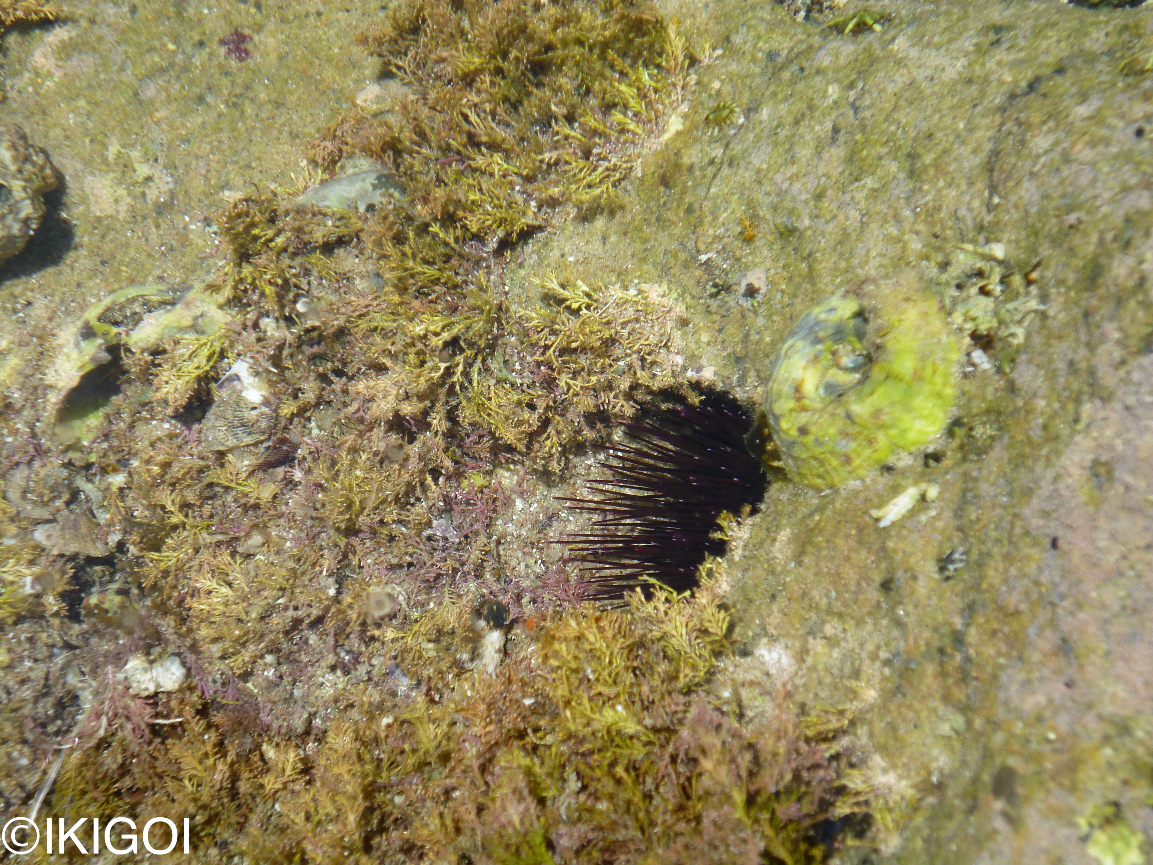 このウニは、岩穴に潜んでいる様子。海藻が近くにある岩に好んで入りやすい。なぜ階層の近くで住んでいるのかというと、ウニの大好物は海藻だからである。ムラサキウニは、海藻の中でもワカメ、昆布が好きで、多くのものを食べてしまうものだから、ワカメや昆布に被害が出ている。しかし、漁業権がかかっているし、穴の中や深いところにいるのが多いので、駆除が厳しいのが現状である。守りすぎても、別のものに被害が出る。いいバランスで守って欲しいものだ。