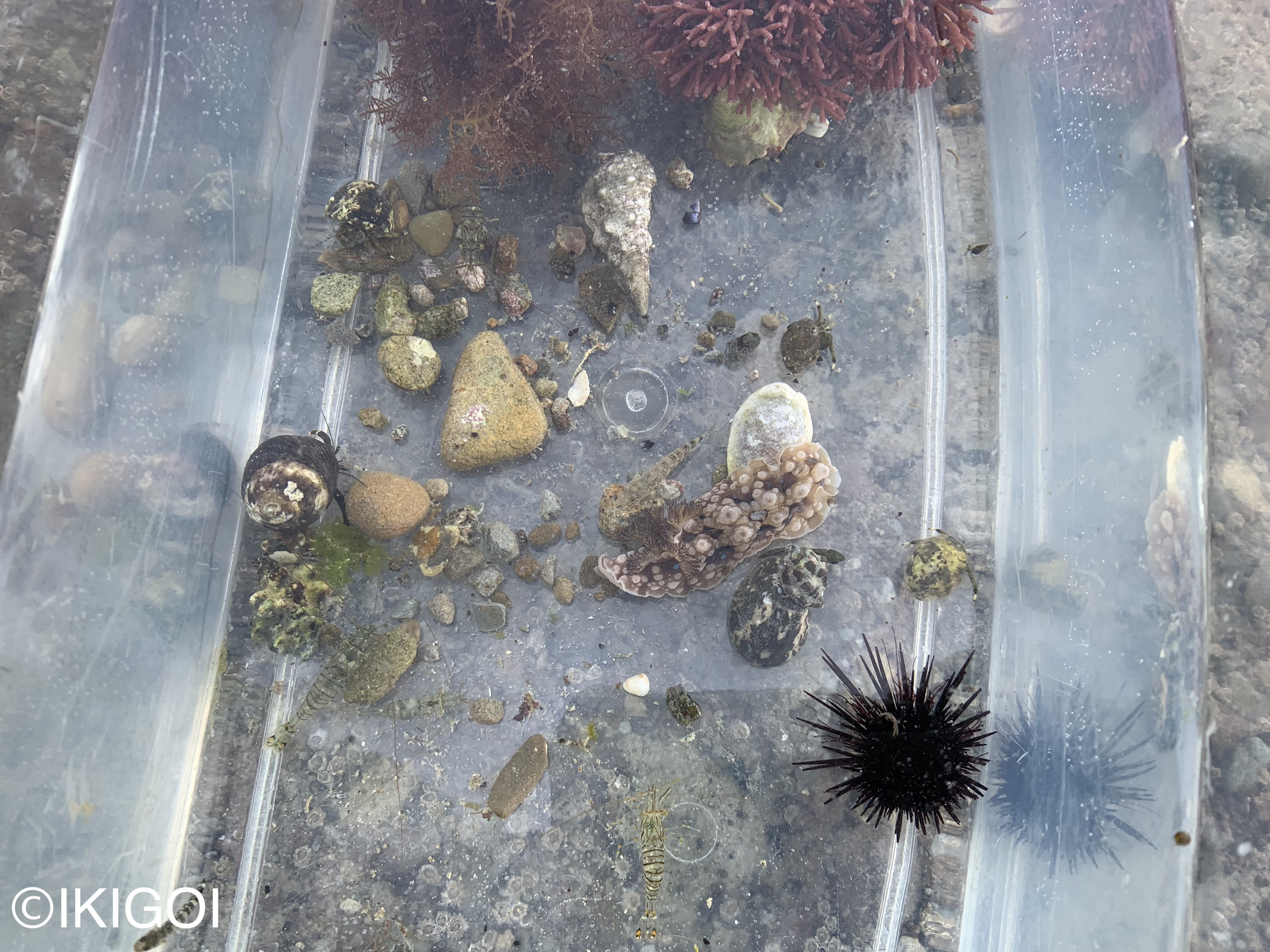 この写真に写っているのは、磯にいる生物たちである。このウニを見ると、棘のまばらさがよくわかるだろう。ウニはこの棘のせいで、プラスチックを突き破ってしまうことが多く、飼育には少なくとも向いていない。餌などの調達も厳しいため、たとえ漁業権を取得してもやめとくことをお勧めいたい。ホンヤドカリの仲間に突かれると嫌がるのも可愛らしい。ホンヤドカリは移動速度が速いため、ぶつかるとそれなりの衝撃をくらうのだろう。その後すぐに逃げていく。色々な問題のあるムラサキウニだが、数がすごく多くても観察してみるとまた面白いことが見つかるかもしれない。