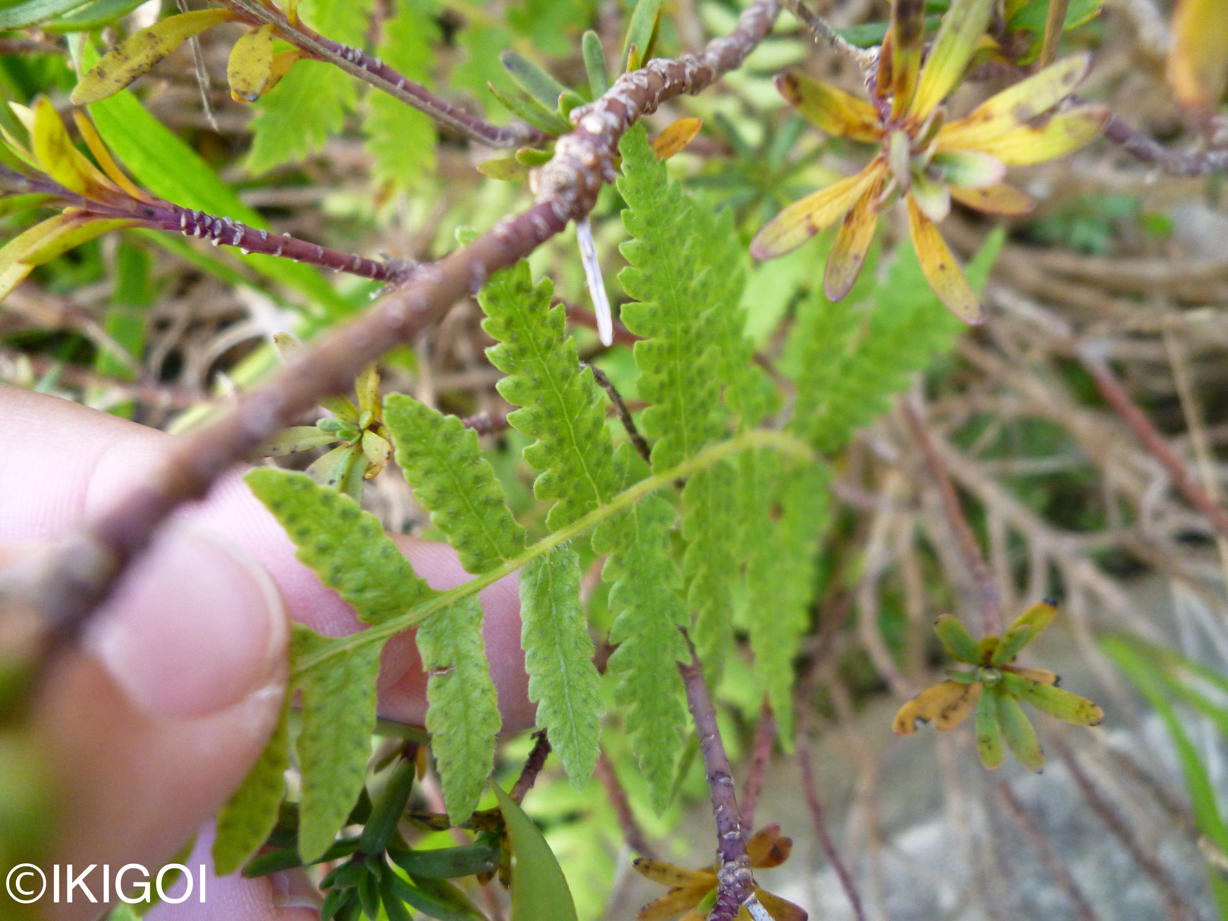 この写真でもよくわかるように裏に毛がない。しかし、シダ植物らしい期間が備わっているのを見て取れる。葉が左右互性であり、順序よく整列している。先の方に行くにつれて、葉の大きさが小さくなり、長さが短くなる。そして裏を見てみると、粒のようなものがあり、もう少し遅いと胞子体が見てとれる。胞子体は大きな黄色の丸がつく。それが見れたらラッキー。